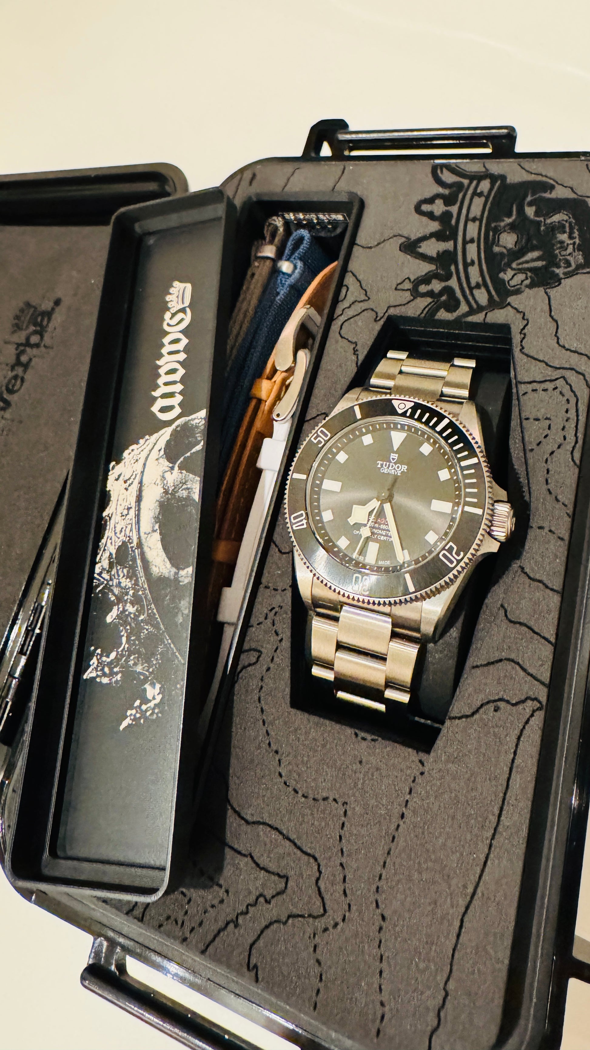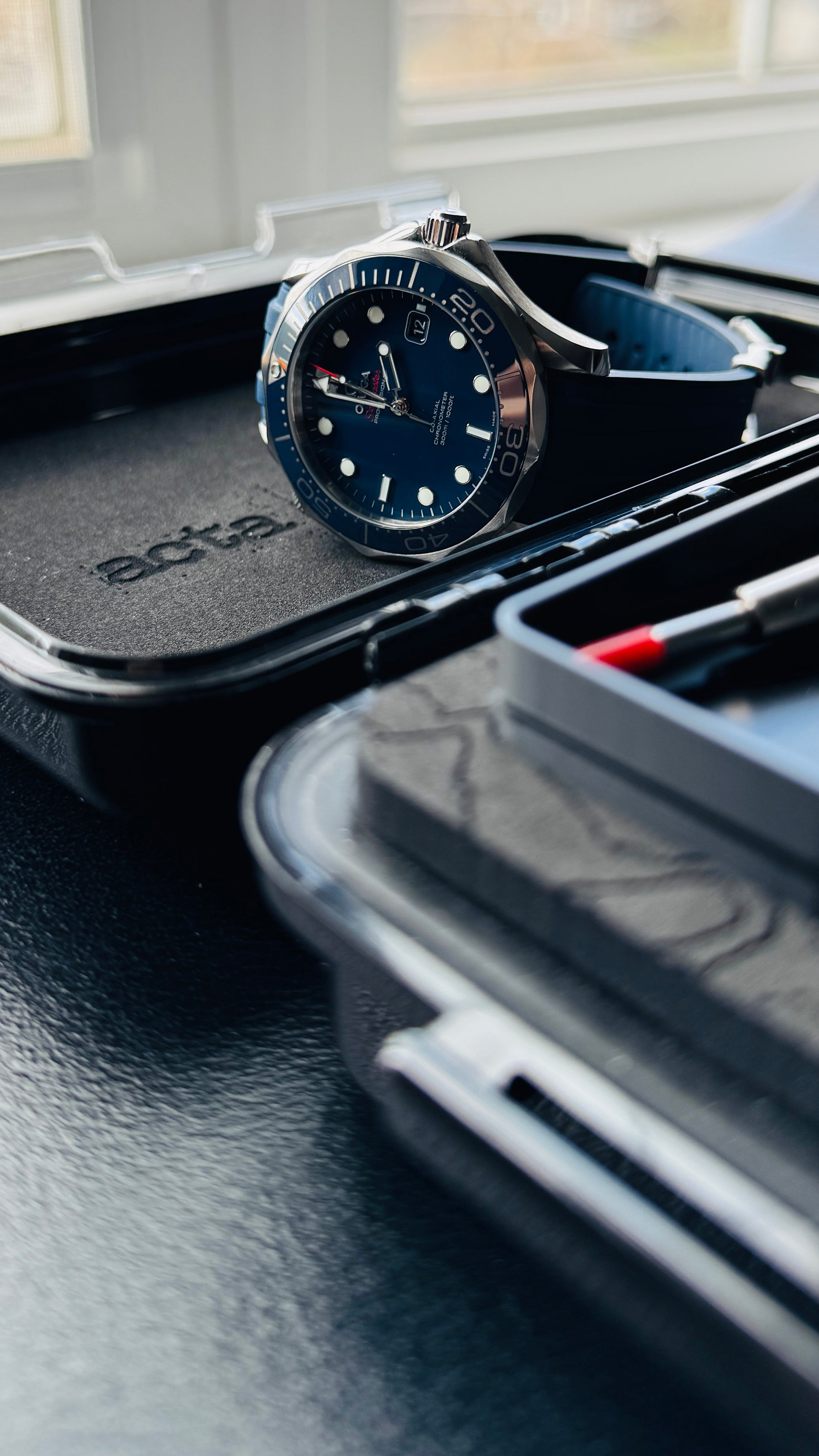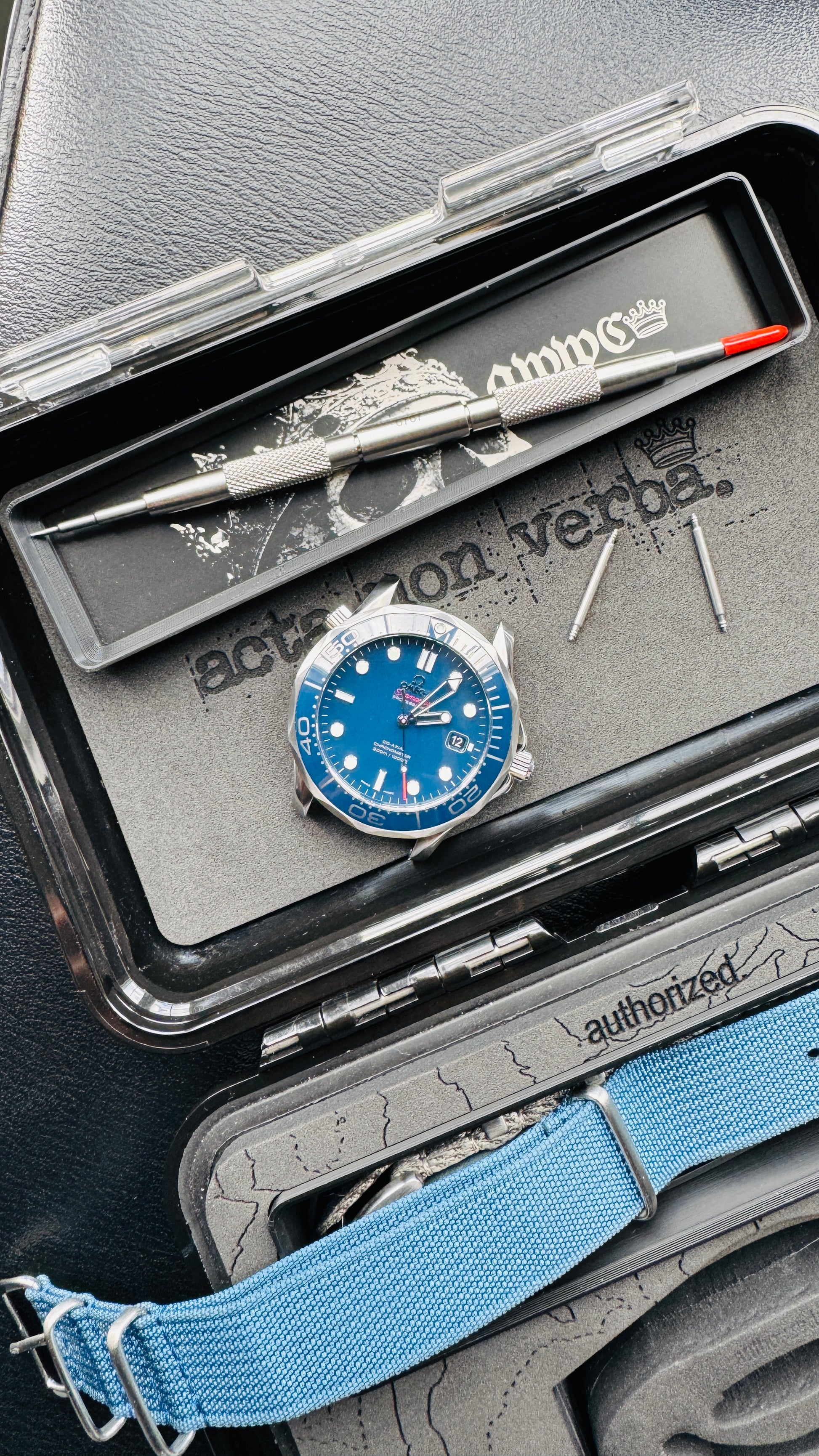 • Foam-lined lid engraved with "acta non verba.", doubles as a soft work surface for strap changes