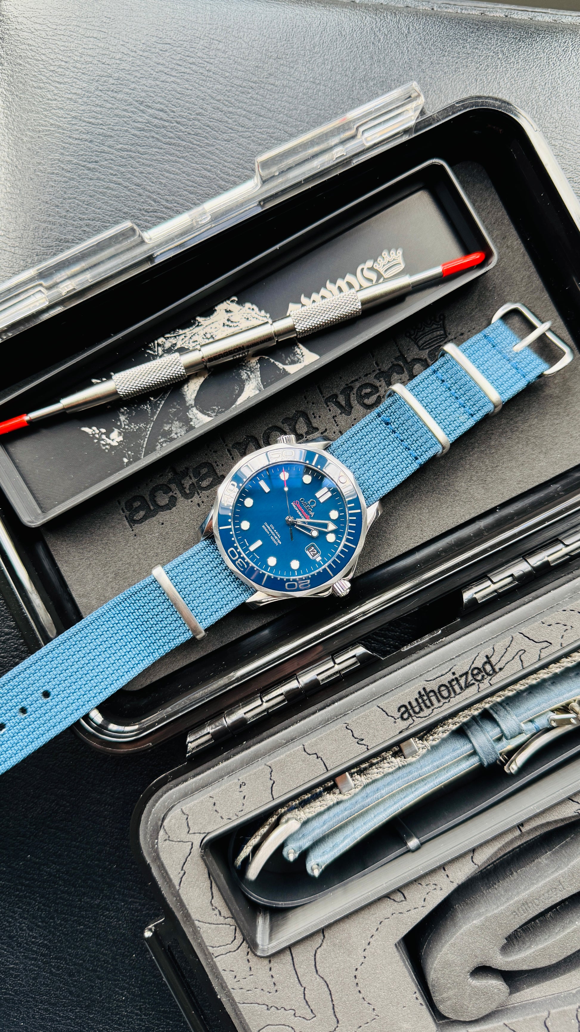 The interior features a secure watch slot with the signature authorized curved silhouette, a dedicated strap bay, and a removable tool tray for strap-changing tools and accessories. Integrated spring bar storage keeps spare parts organized, while a hidden AirTag compartment beneath the foam adds peace of mind during travel. The foam-lined lid is engraved with “acta non verba.” and doubles as a soft work surface for strap changes.