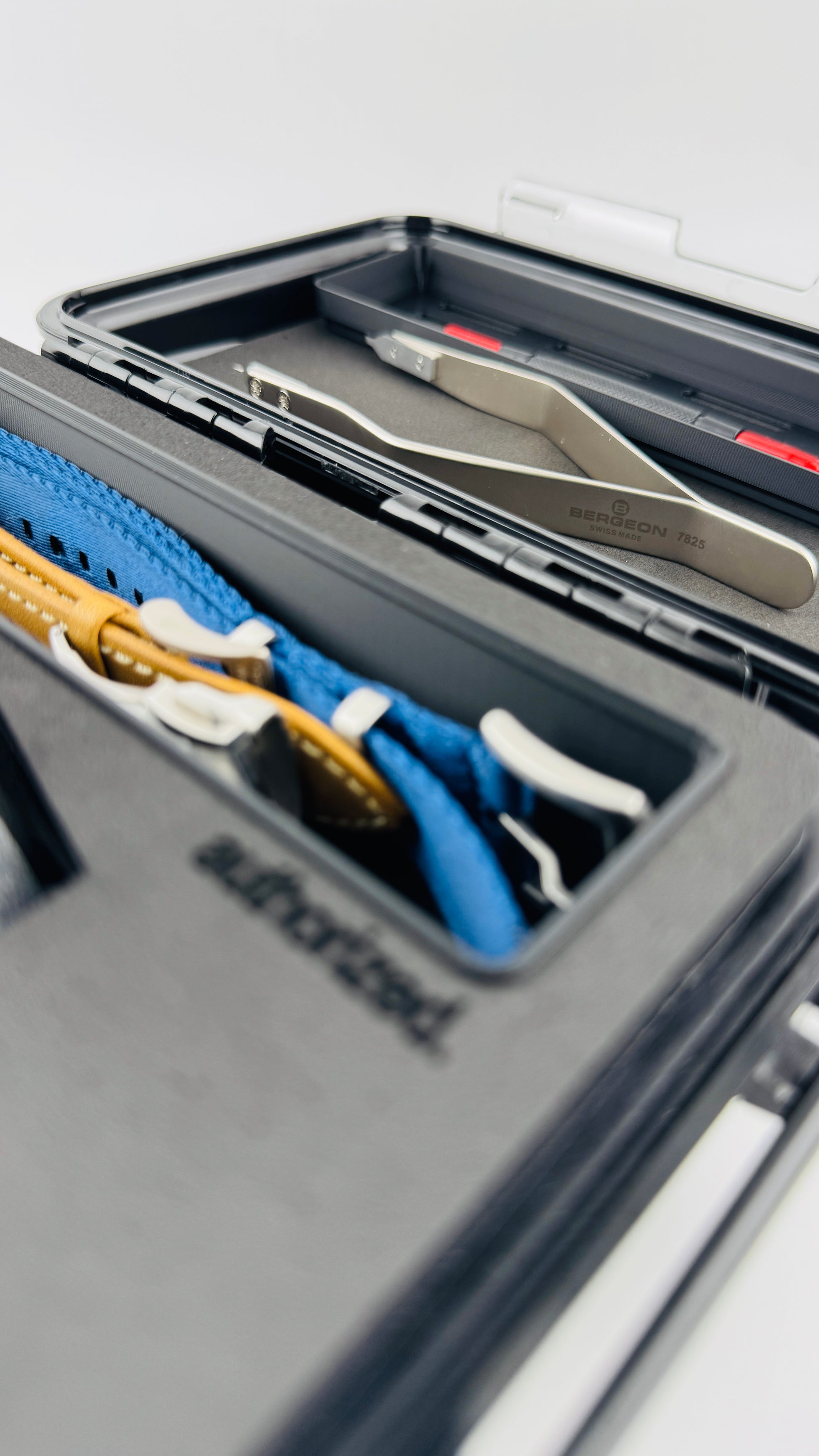 Inside, Vault One features a redesigned slimmer watch slot that maintains the signature authorized curved silhouette while offering a more secure hold. A dedicated strap bay keeps multiple straps organized and accessible, and a top tool tray stores spring bars, tools, and other essentials. A discreet AirTag compartment is hidden beneath the foam for added peace of mind during travel, and the foam-lined lid doubles as a soft workspace for strap or bracelet changes.